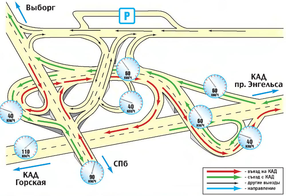 Кольцевая автомобильная дорога отвечает за необходимость разнообразных развязок, которые предусмотрены для передвижения на автомобиле. На пересечении КАД с перспективным направлением на Приозерск, схема развязки создана с классическими переходами, которые сделаны из двух уровней. На ней существуют